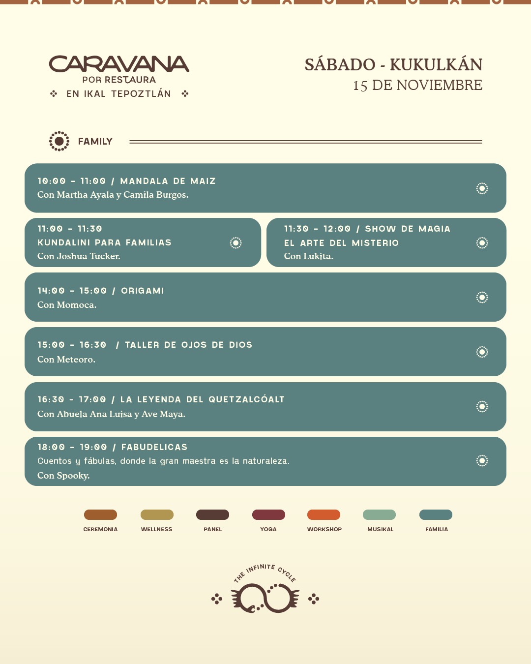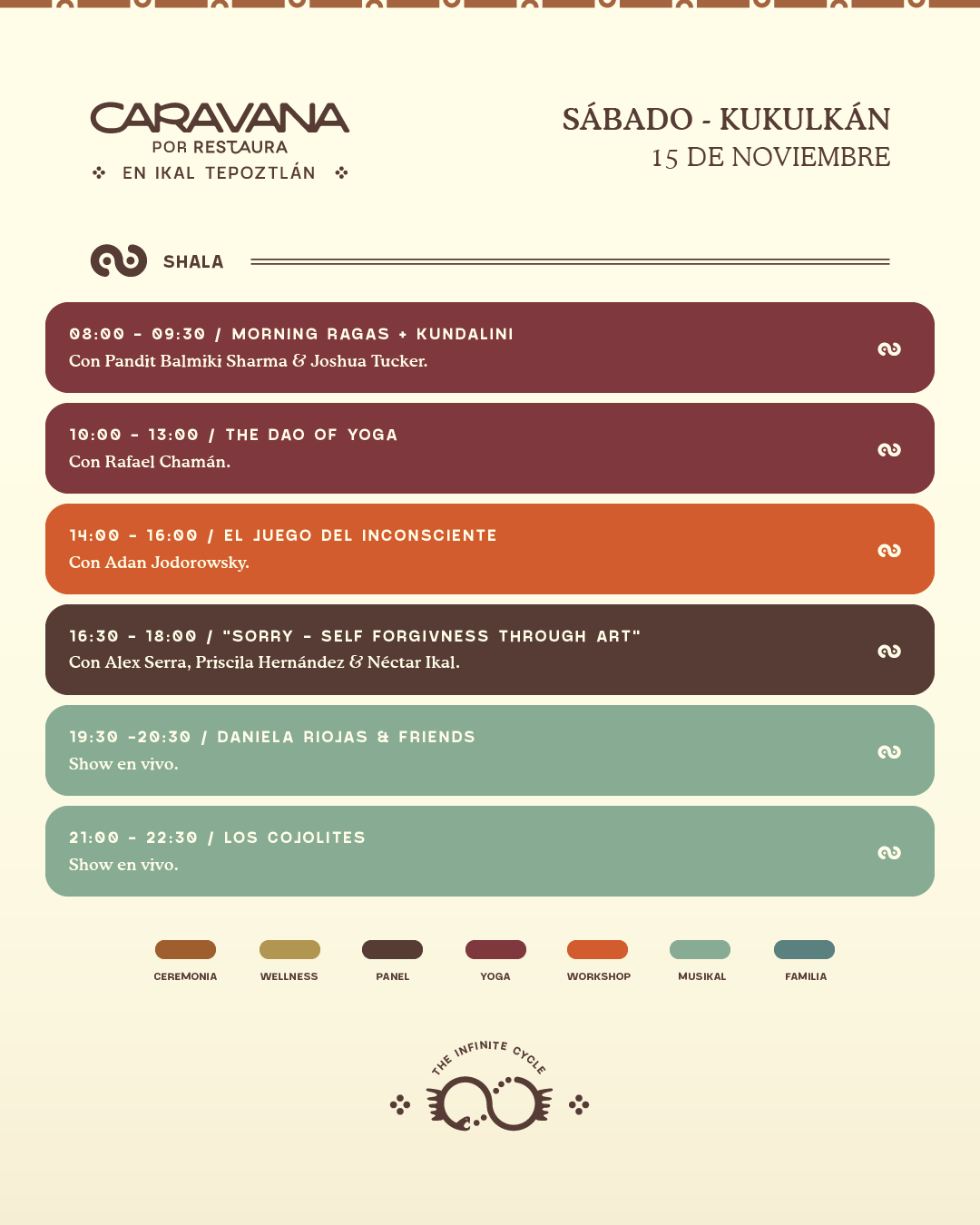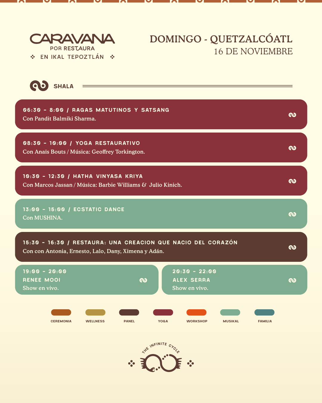 En CARAVANA por RestAura tendremos 5 escenarios simultáneos y más de 40 colaboradores, con un programa por día para sentarnos al fuego en comunidad a recibir las enseñanzas de los abuelos, compartir ceremonias, clases de yoga, talleres, paneles, arte, danza, conciertos y actividades para las infancias.